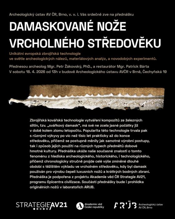 Zbrojířská kovářská technologie vytváření kompozitů ze železných slitin, tzv. „svářkový damask“, má své ne zcela jasné počátky již v době kolem zlomu letopočtu. Popularita této technologie trvala pak s různými výkyvy po víc než tisíc let prakticky až do konce středověku, přičemž se postupně měnily jak samotné výrobní postupy, tak i způsob jejich použití na různých typech předmětů dobové hmotné kultury. Přednáška ukáže naše současné znalosti o tomto fenoménu z hlediska archeologického, historického, i technologického, přičemž chronologicky stručně projde celé výše zmíněné dlouhé období s těžištěm výkladu ve vrcholném středověku, kdy byl damask používán pro výrobu čepelí luxusních nožů a krátkých bodných zbraní. Přednáška je podpořena z projektu Akademie věd ČR Strategie AV21, programu Epicentra civilizace. Součástí přednášky bude i prohlídka originálních nožů v laboratořích ARÚB.