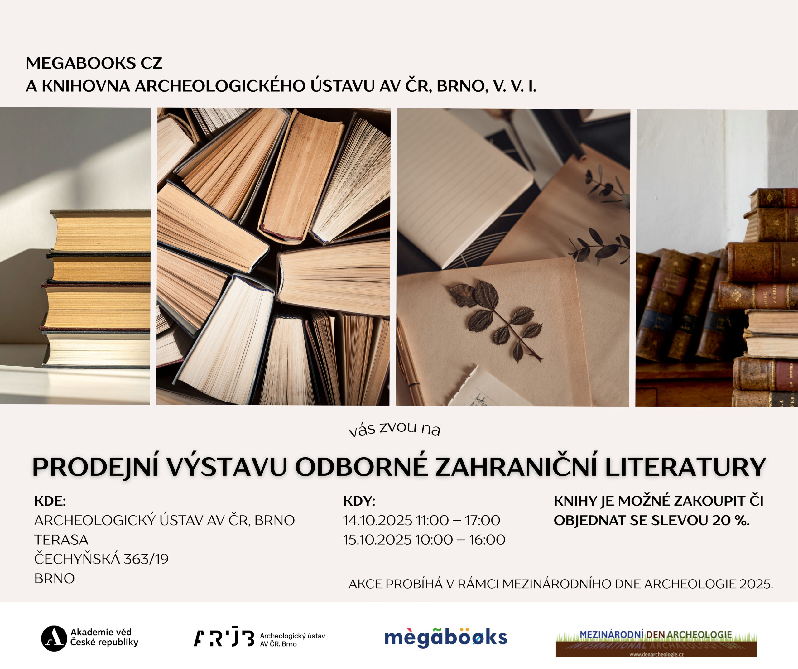 Knihovna Archeologického ústavu a Megabooks CZ vás zvou na prodejní výstavu zahraniční odborné literatury, která se uskuteční ve dnech 14. a 15. 10. na terase naší budovy na adrese Čechyňská 19 v Brně.