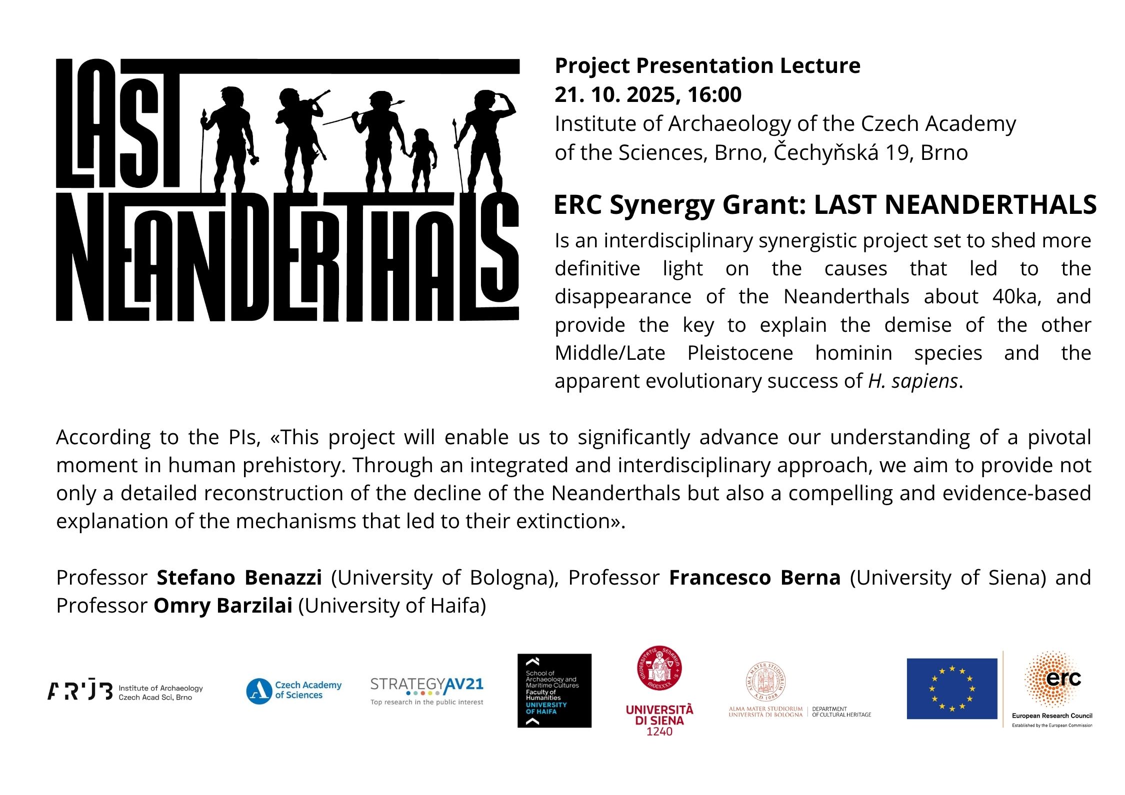 Zveme Vás na přednášku v rámci ERC Synergy Grant, ve které bude představen mezinárodní projekt LAST NEANDERTHALS, na němž kolegové Archeologického ústavu AV ČR, Brno pod vedením Ing. Petra Škrdly, Ph.D., DSc. od letošního roku participují. Projekt představí Professor Stefano Benazzi (University of Bologna), Professor Francesco Berna (University of Siena) a Professor Omry Barzilai (University of Haifa)